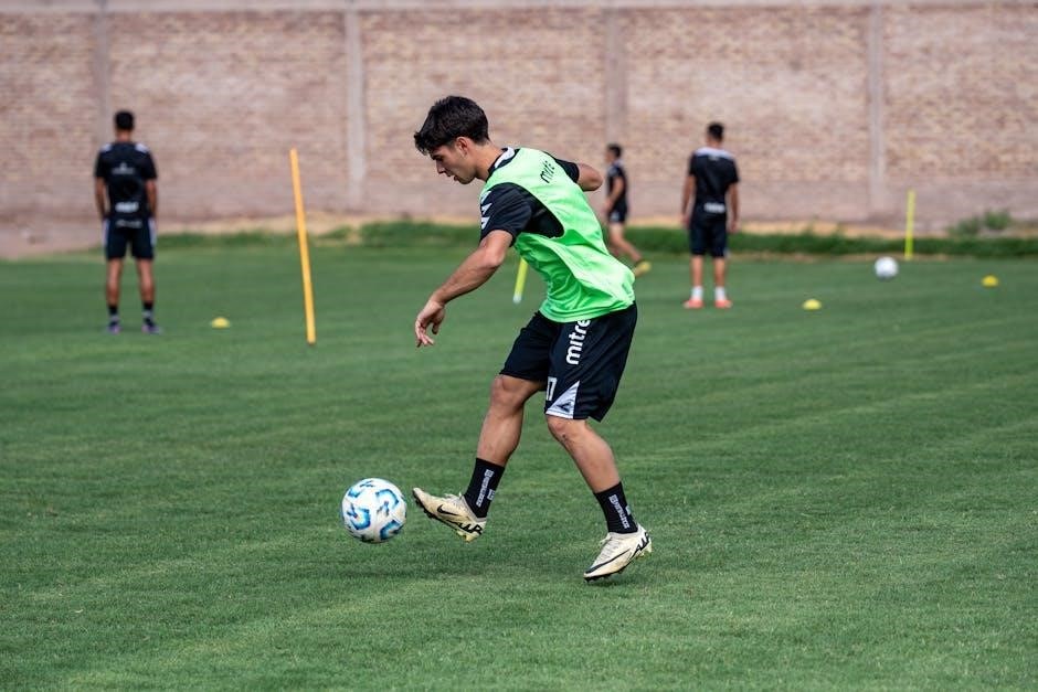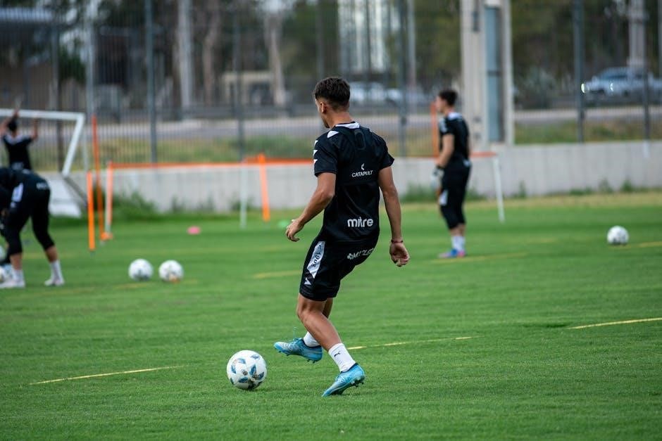 Soccer drills PDFs often feature dedicated sections on wing play, emphasizing 1v1 battles, beating defenders, and delivering accurate crosses into the box. These drills aim to improve players’ dribbling skills, speed, and decision-making in wide areas.